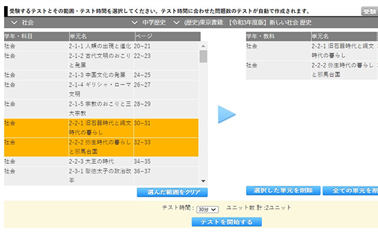 主要な検定教科書の目次にあわせてテスト範囲を指定することで、すららに登録されている問題を引き出し、学校の授業進度に合わせた小テストを手軽に作成することができます。
