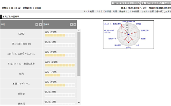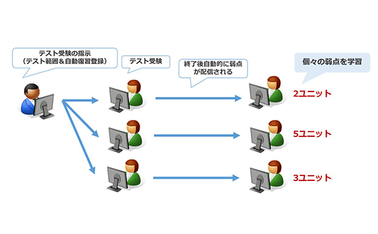 テスト実施後は、自動で採点が行われ、一人一人に必要な復習箇所の学習指示を一括で行うことができます。