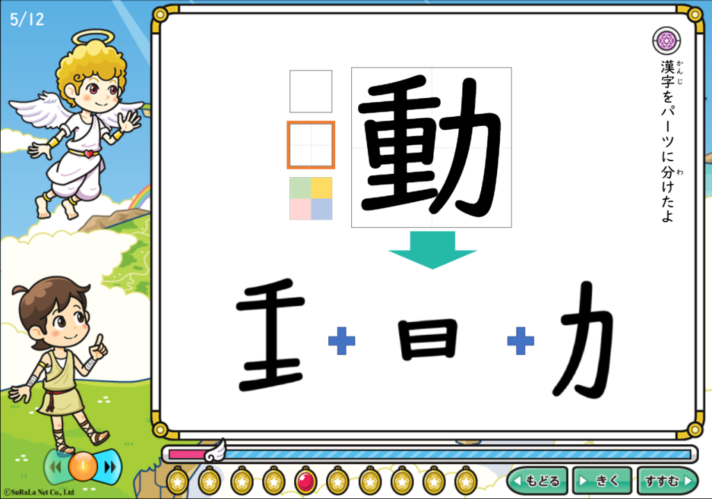 すらら漢字アドベンチャーの3つ目の学習法 「パーツのくみあわせでおぼえる」は、他の学習法がシチュエーション別に漢字を覚えやすくしていたのに対し、 他の学習法とは異なる順番で、形の似た漢字が一緒に覚えやすくなる工夫がされてます。