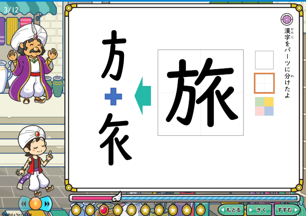 また、 すらら漢字アドベンチャーにはもう1つ、 「パーツのくみあわせでおぼえる」漢字学習法があります。これは、漢字のパーツを覚えて組み合わせることで、覚えにくい漢字の骨組みを覚え、漢字が苦手な気持ちを軽減します。