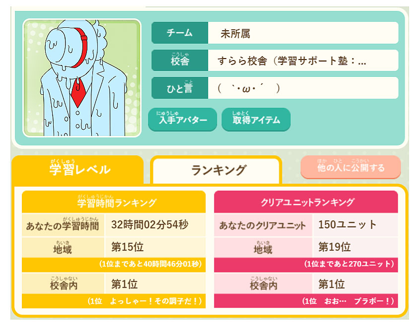 3ヶ月程度の短期目標を立てるところで役立っています。すらら内で目標を立ててこれが達成できたらご褒美みたいな形で使っています。先日も夏休み入るまでの目標を立てて、それを自分である程度管理していきなさいと伝えました。それがうまく実行することができたら、目標は達成という感じにしています。現在、行っているすららの校舎内ランキングを一位に保てるかを半分子どもと賭けのゲームような形で進めています。