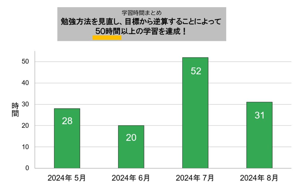 そのように目標を立てることで何か効果は出たりしていますでしょうか。7月に学習時間が50時間を超えていたのもその効果の一つと考えているのですが、いかがでしょうか。