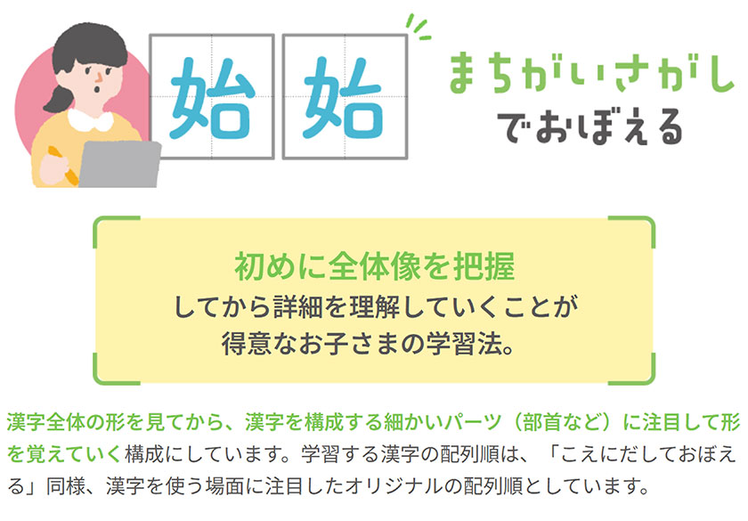 やっぱり、最初に検査があって、その子に合った覚え方で進められるところですね。3タイプの中で、うちの子には「間違い探し」が合っていたってわかってから、無理なく覚えられるようになったんです。