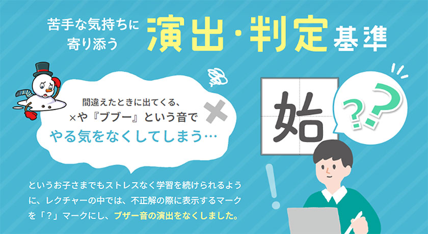 漢字学習の常識を覆す「すらら漢字アドベンチャー」。認知特性Web診断テスト「LIFT」の結果と連動し、「唱えて覚える」「間違いで覚える」「パーツの組み合わせで覚える」の3つの覚え方を用意。お子さまの認知特性に合わせた学習方法を提案します。