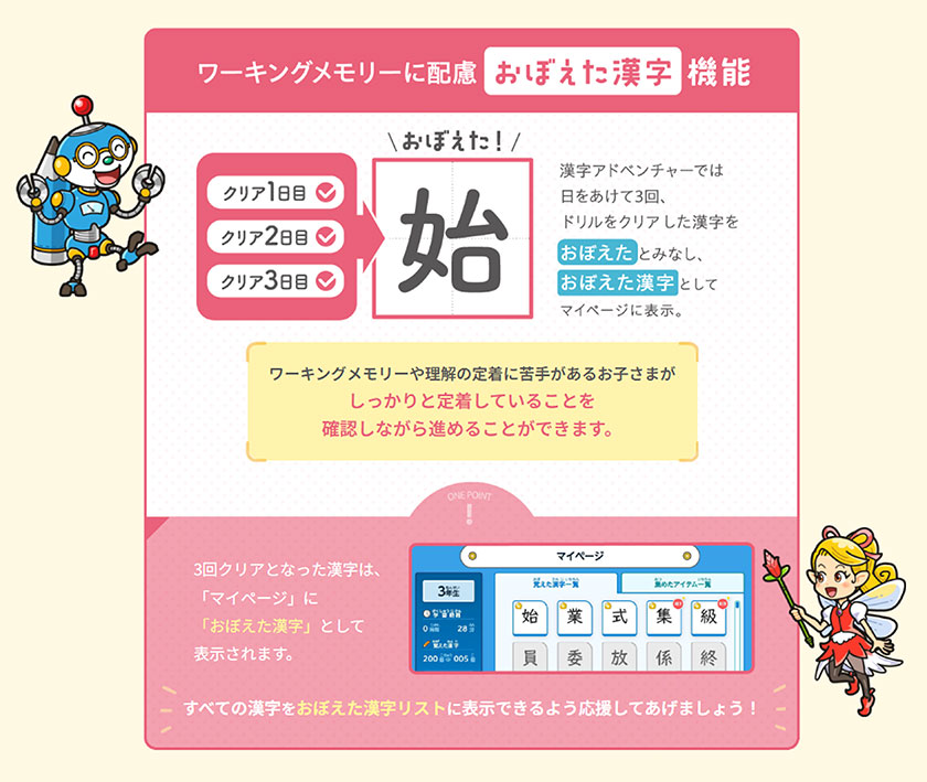 一番はやっぱり「繰り返しできる」ことですね。1つのステージで3回までチャレンジできて、それで覚えたら次に進むっていう仕組みがすごく合ってました。また、ドリルで3回クリアになった漢字は「おぼえた漢字一覧」に登録される仕組みもよかったです。今までの頑張りが見える化して学習の積み重ねを実感できるようです。