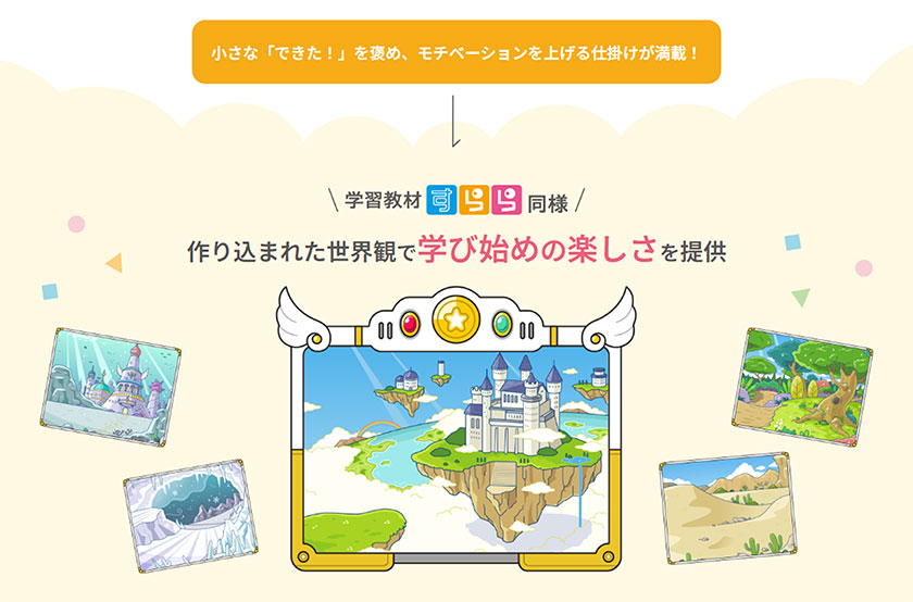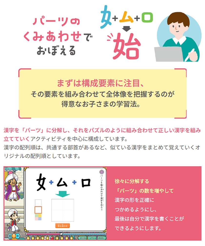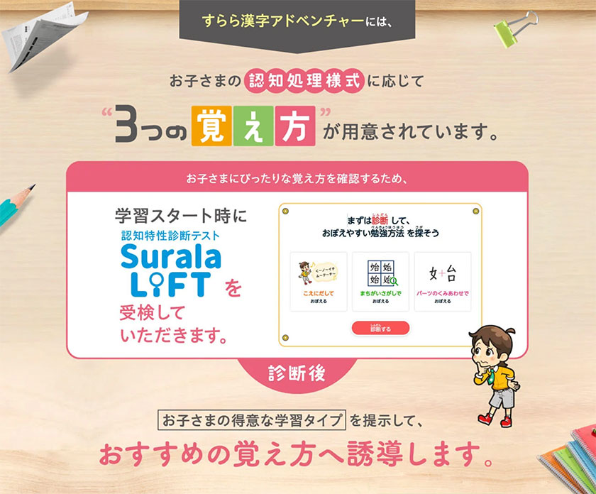 漢字学習の常識を覆す「すらら漢字アドベンチャー」。認知特性Web診断テスト「LIFT」の結果と連動し、「唱えて覚える」「間違いで覚える」「パーツの組み合わせで覚える」の3つの覚え方を用意。お子さまの認知特性に合わせた学習方法を提案します。